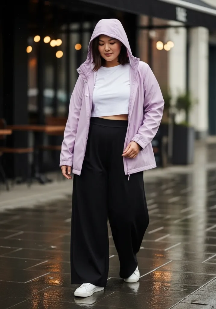 A blush pink hooded rain jacket creates a soft and modern silhouette in this outfit. Underneath sits a simple white cropped top paired with loose black wide leg pants that flow naturally as you walk. Crisp white sneakers complete the look and add a sporty touch that keeps everything relaxed.
