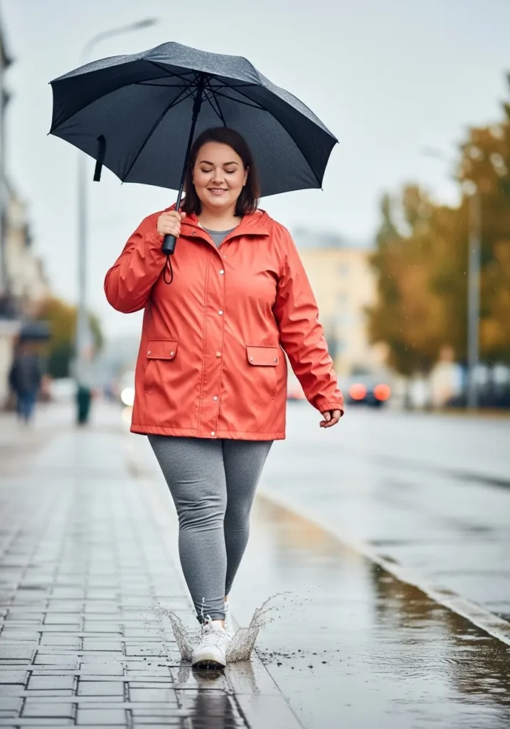 A bright coral rain jacket adds instant energy to this rainy day look. The jacket is paired with gray leggings that hug comfortably and white sneakers that keep the outfit sporty and casual. A dark umbrella keeps the focus on the vibrant jacket while protecting from steady rain.