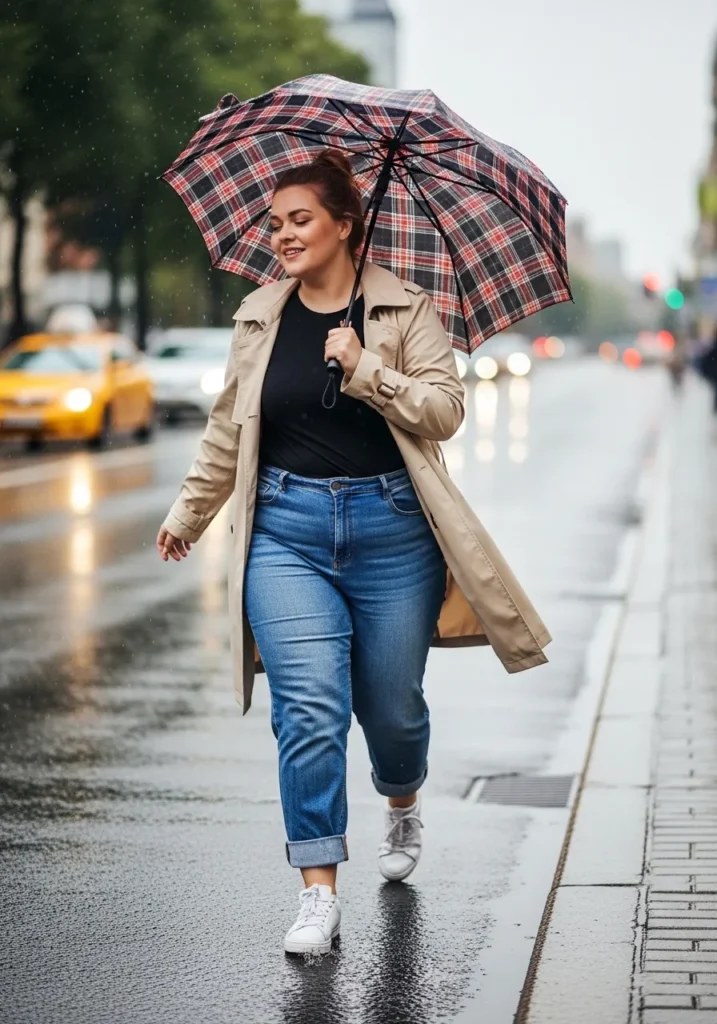 A timeless beige trench coat brings a polished feel to this rainy spring outfit. Underneath sits a simple black top paired with relaxed blue jeans that show soft creases from movement. White sneakers keep the outfit comfortable while a plaid umbrella adds a charming touch.