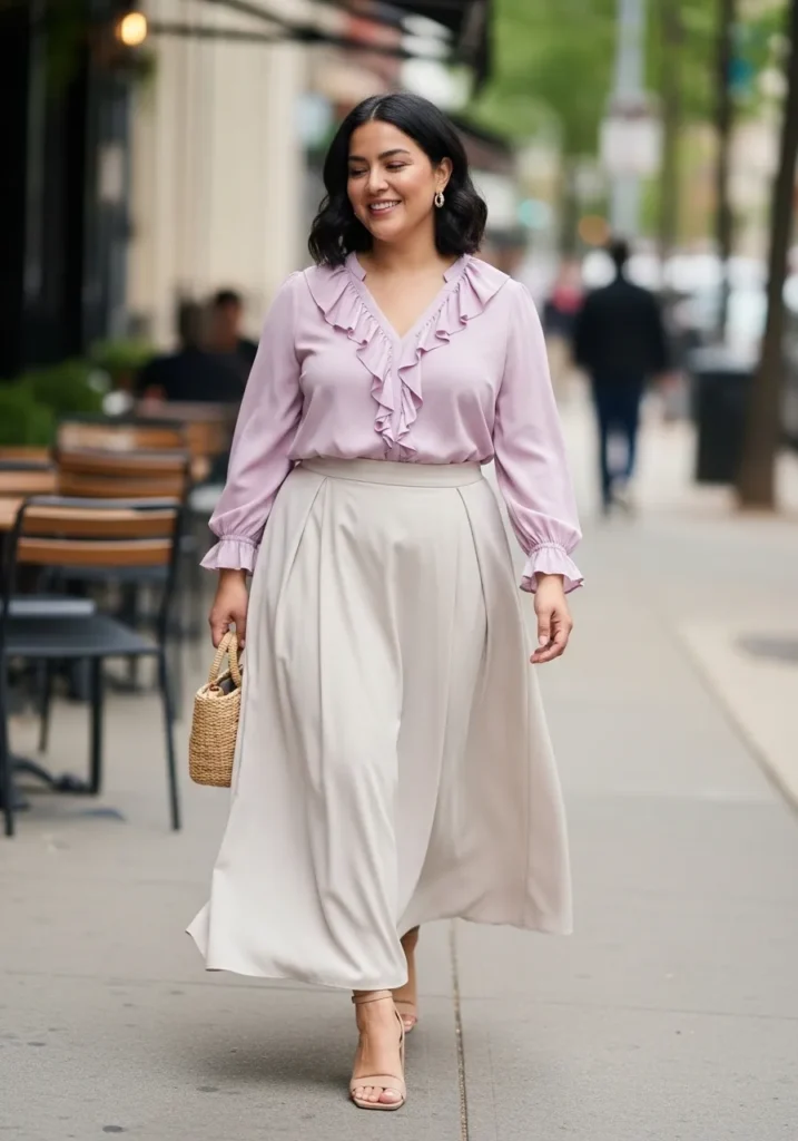 This outfit pairs a delicate lavender blouse with a high waisted ivory maxi skirt that glides beautifully with every step. The blouse is lightly tucked to define the waist, and the skirt flows down in a soft, graceful line. Neutral heels and a woven handbag add subtle texture. The vibe feels elegant, romantic, and just a little bit dreamy.