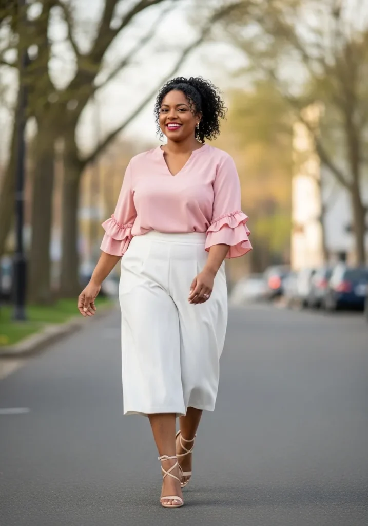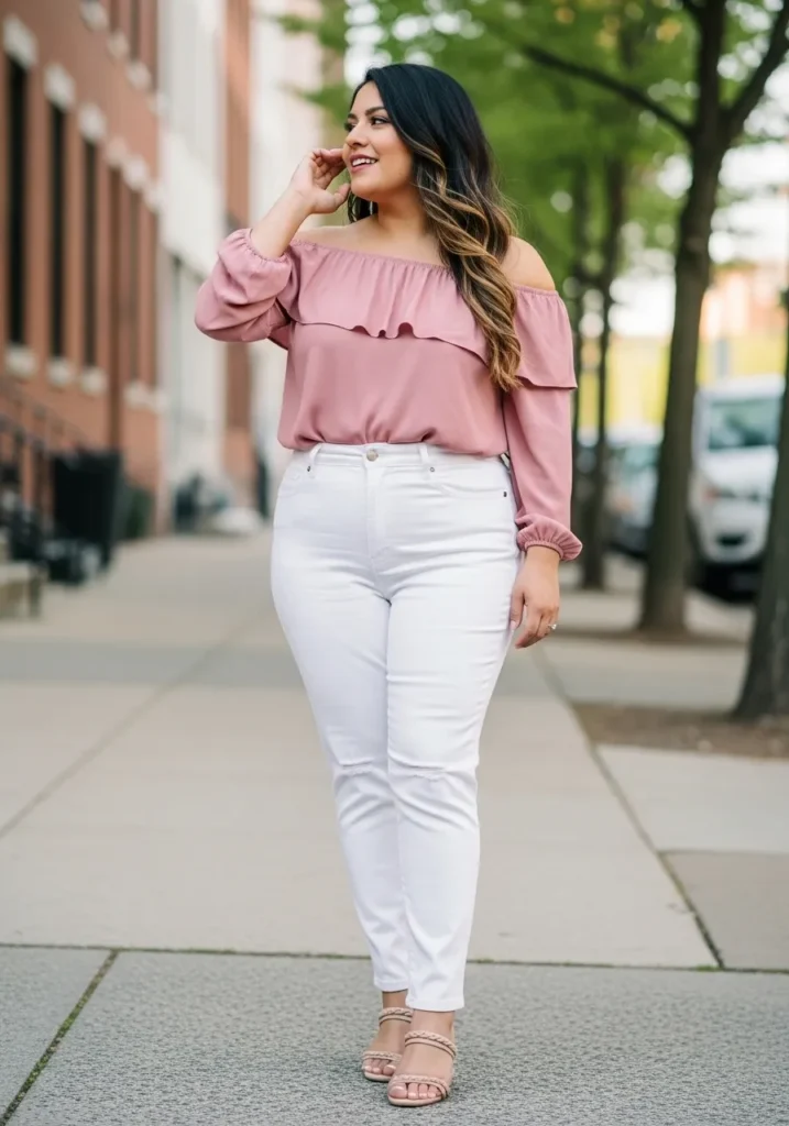 White jeans in spring always make me feel like the season has officially arrived. I love how the fitted silhouette shows off curves while the flowy blouse adds balance on top. The soft pink shade is flattering on so many skin tones, and it gives that gentle romantic energy without feeling overly sweet. I would reach for this when I want something simple but undeniably pretty.