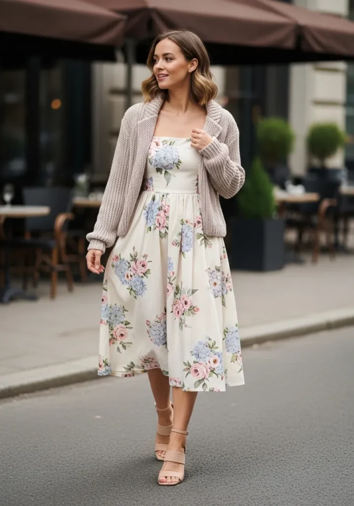 This outfit features a delicate floral midi dress in soft pastel tones layered under a light beige cardigan. The dress has a flattering fit and flare silhouette that gently skims the hips and moves beautifully as you walk. Nude heels keep the look refined, while the cardigan adds a touch of warmth and texture. The whole vibe is feminine, sweet, and quietly charming.