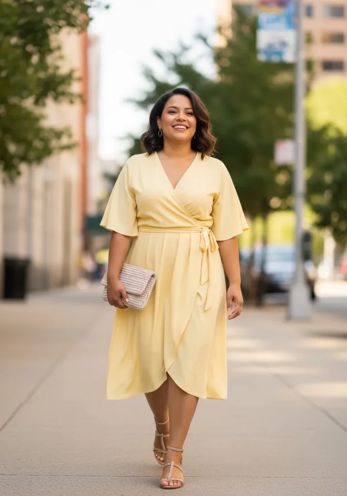I cannot get over how flattering a wrap dress is on curves. It hugs in the right places and drapes beautifully everywhere else. The yellow shade feels fresh and uplifting, which makes it perfect for a sweet spring evening. If I wore this on a date, I would feel radiant and feminine without trying too hard.