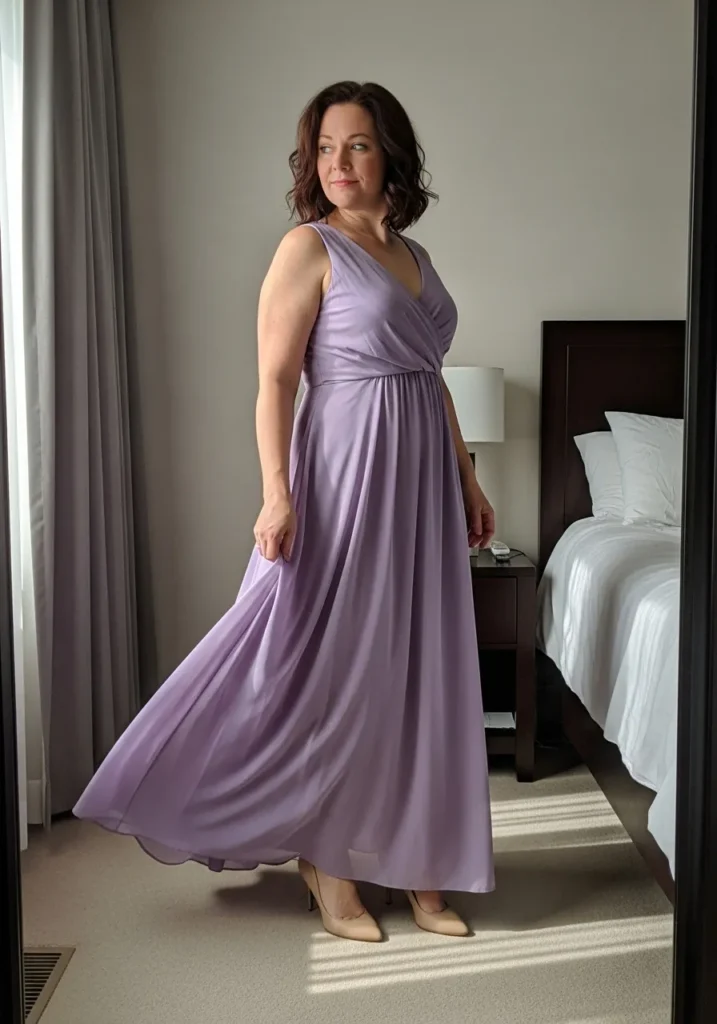 This outfit centers around a flowing lavender maxi dress with a sleeveless cut and softly gathered waist. The fabric drapes gracefully to the floor, creating elegant movement with every step. The pastel tone keeps it gentle and romantic, while simple heels let the dress be the star. The silhouette is long and elongating, yet still easy and wearable.