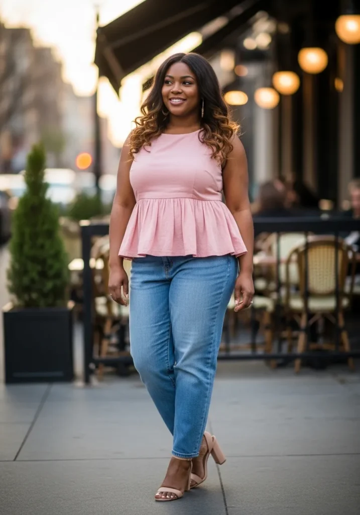 This look combines a blush peplum top with fitted blue skinny jeans. The peplum detail flares gently at the waist, creating shape and balance. The jeans add structure and keep the outfit grounded. Neutral heels elevate the look just enough for a dinner date, while the soft pink tone keeps it feminine and sweet.