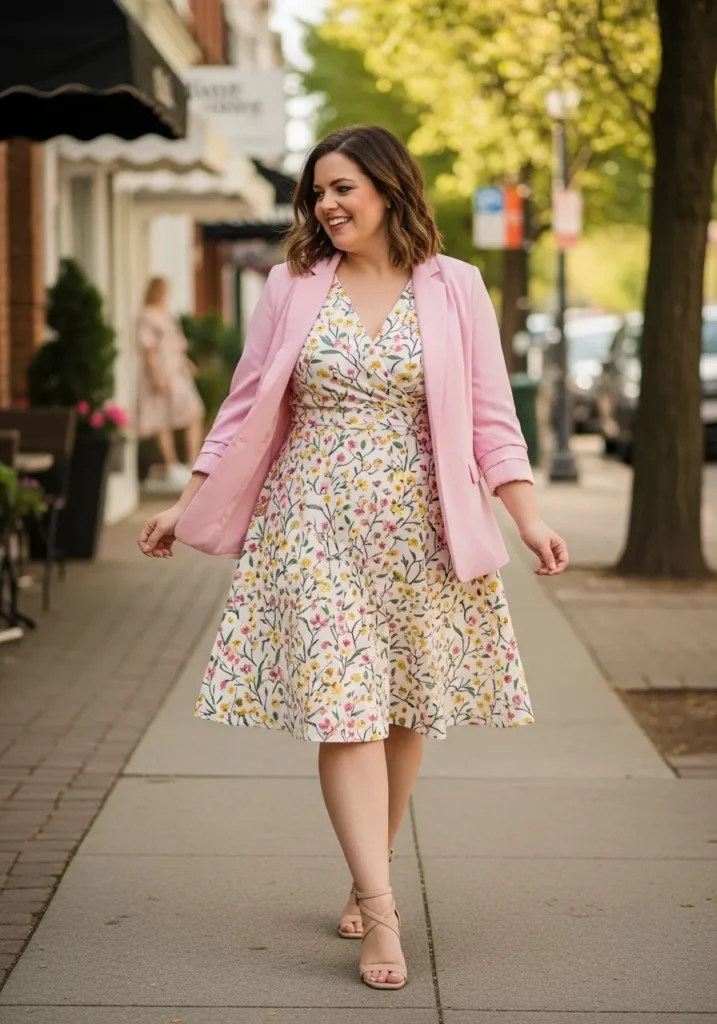 This outfit features a floral knee length dress layered with a soft pink blazer. The dress has a gentle A line shape that flatters the hips, while the blazer adds structure and polish. Nude heels tie everything together and keep the palette cohesive. The mix of florals and tailored outerwear feels balanced and stylish.