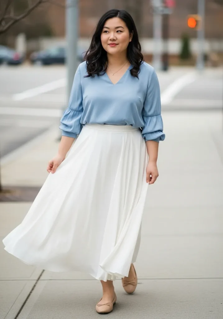 Powder Blue Blouse with Flowing White Maxi Skirt