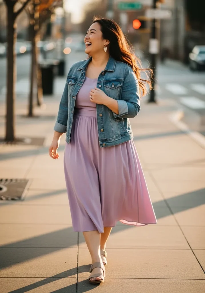 Here we have a flowy mauve midi dress layered under a structured medium wash denim jacket. The dress drapes beautifully over the body with a soft pleated skirt that moves as you walk. The dusty mauve shade feels romantic and flattering, while the cropped denim jacket adds just the right amount of casual balance. Neutral heels finish the look and keep it sweet and spring appropriate.