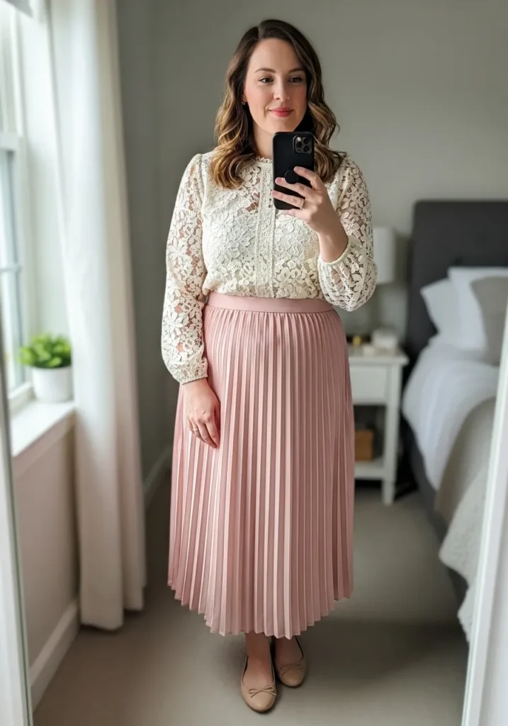 This outfit combines a delicate cream lace blouse with a blush pleated midi skirt for a look that feels timeless and tender. The lace top adds texture and intricate detail, while the high waisted pleated skirt creates soft movement and structure. The muted pink tone of the skirt pairs beautifully with neutral heels, making the whole outfit feel airy and graceful.