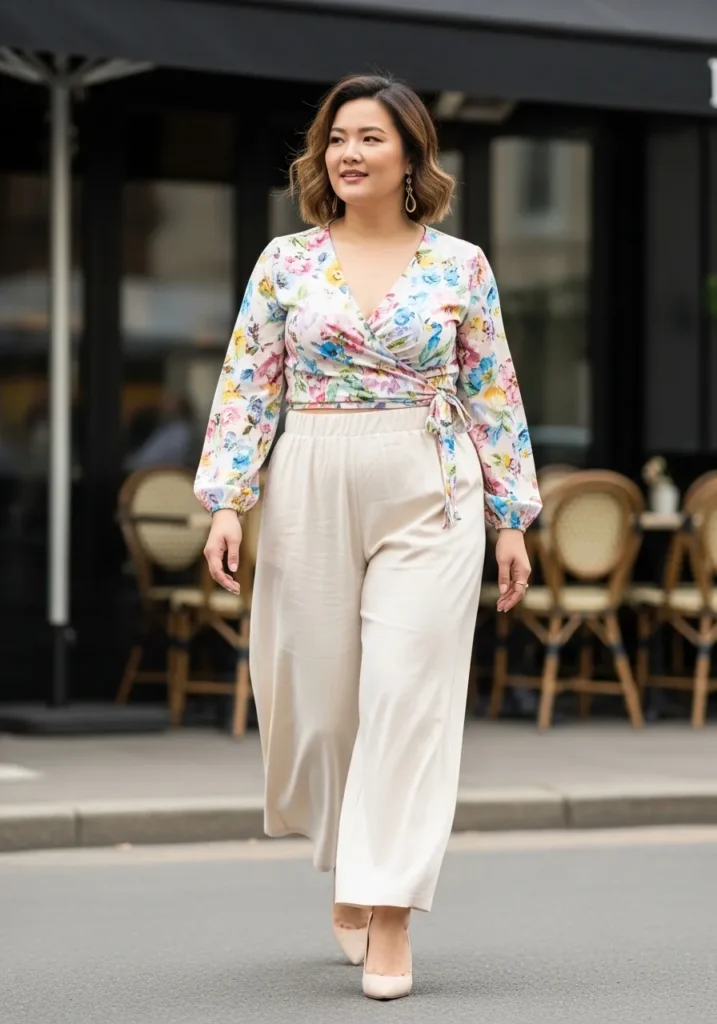 This outfit features a light floral blouse in soft pastel tones tucked into flowing cream wide leg trousers. The blouse has a delicate print that feels playful yet elegant, and the high rise pants create a smooth, elongated line. Neutral heels peek out from beneath the hem, adding height without stealing attention. The whole look feels breezy and romantic with a touch of modern polish.