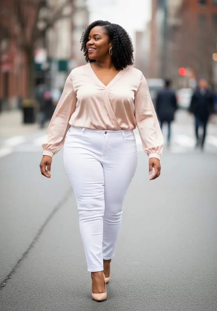 This look combines a silky blush pink blouse with crisp white skinny jeans that hug the curves beautifully. The blouse has a relaxed drape with subtle sheen, which contrasts nicely against the structured denim. Nude pumps elongate the legs and keep everything cohesive. The overall feel is clean, fresh, and softly romantic.