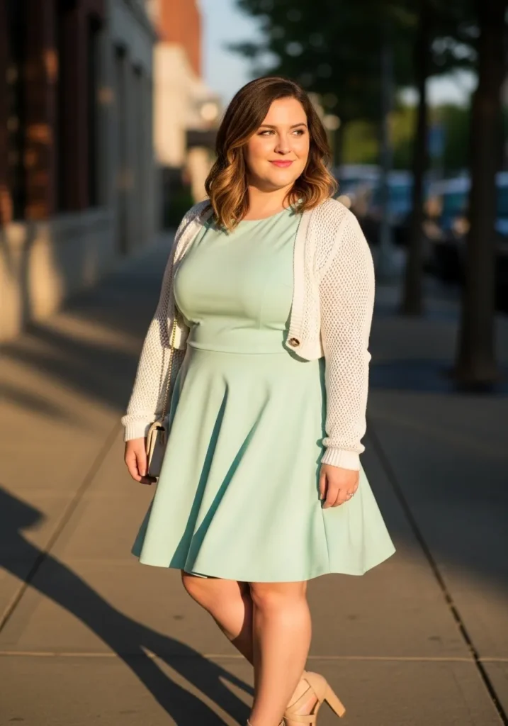 This outfit showcases a sage green fit and flare dress with a gently cinched waist and flared skirt that hits just above the knee. The soft fabric contours the bodice and then opens up into a playful silhouette. A light cardigan draped over the shoulders adds warmth and dimension. Neutral heels complete the look with a subtle lift.