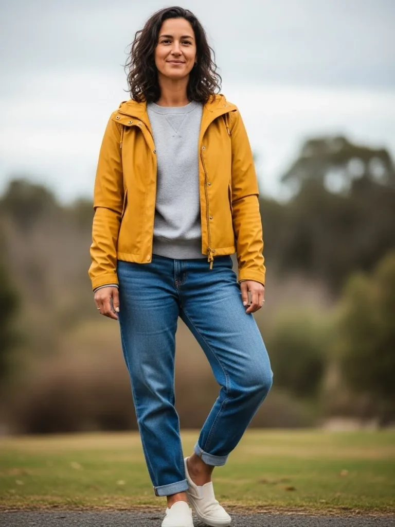 This look centers around a mustard yellow jacket paired with a simple top, relaxed blue jeans, and crisp white sneakers. The pop of color brings life to a gray day while keeping the outfit casual and functional.