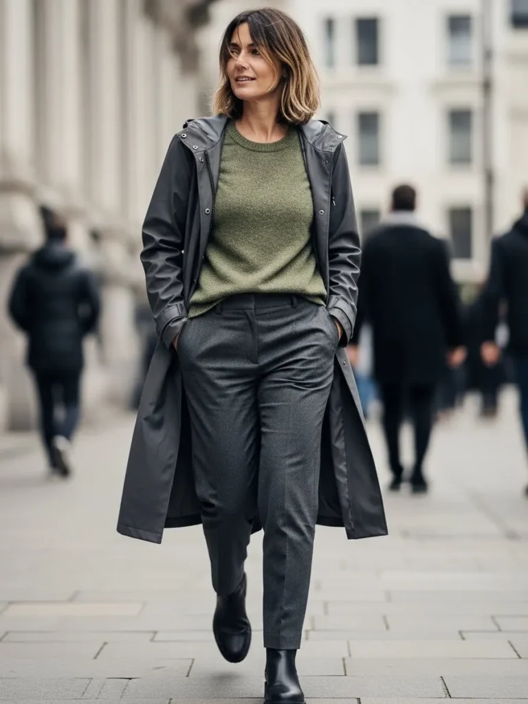 A long dark coat is layered over a soft green knit sweater, styled with tailored dark trousers and comfortable shoes. The longer silhouette adds polish, while the fabrics keep it wearable for wet weather.