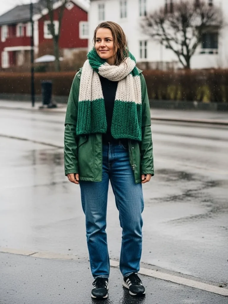 This look features a green jacket styled with a chunky two tone scarf, classic blue jeans, and practical shoes. The scarf adds warmth and texture, making the outfit feel extra cozy for rainy days.