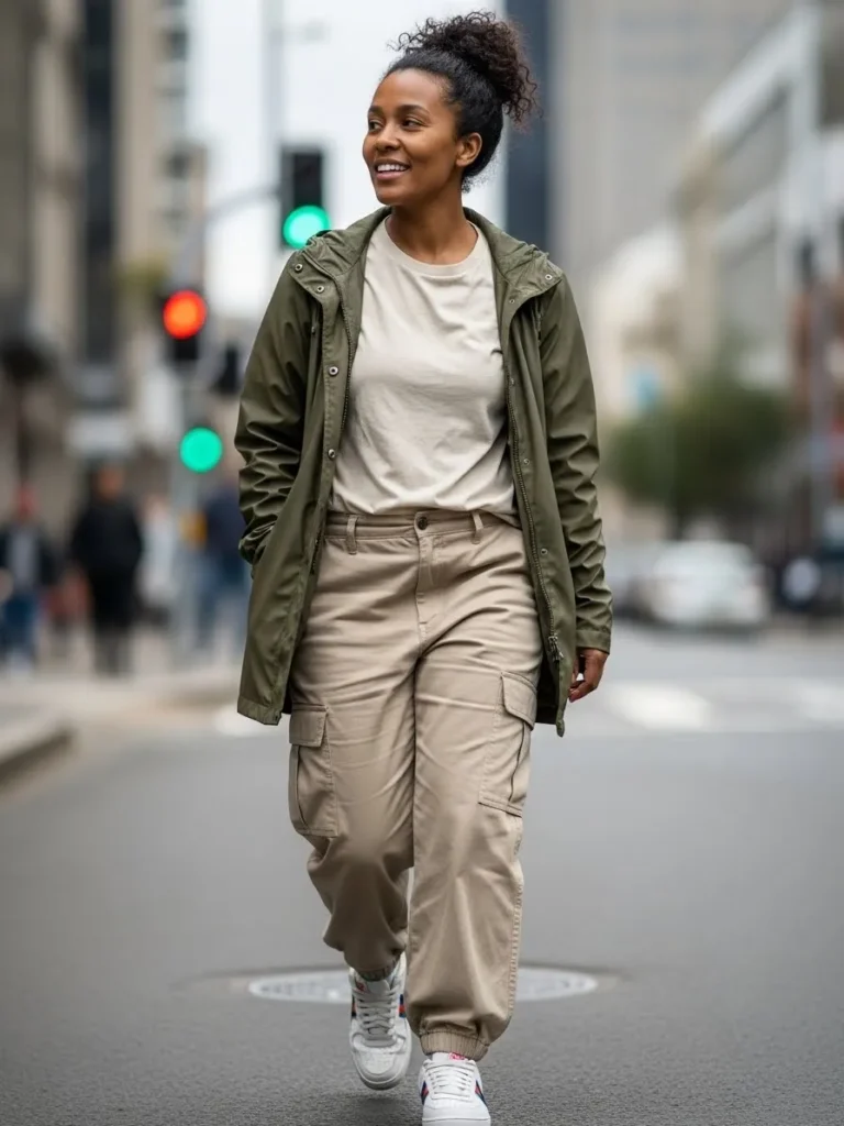 This outfit mixes a lightweight olive utility jacket with a soft beige tee and relaxed khaki pants that feel easy but still pulled together. Clean white sneakers keep it practical for wet sidewalks, while the neutral color palette feels calm and effortless for a rainy city walk.