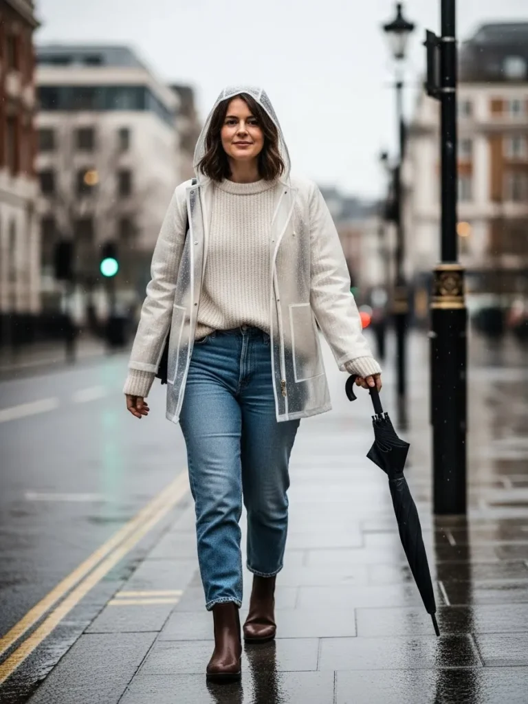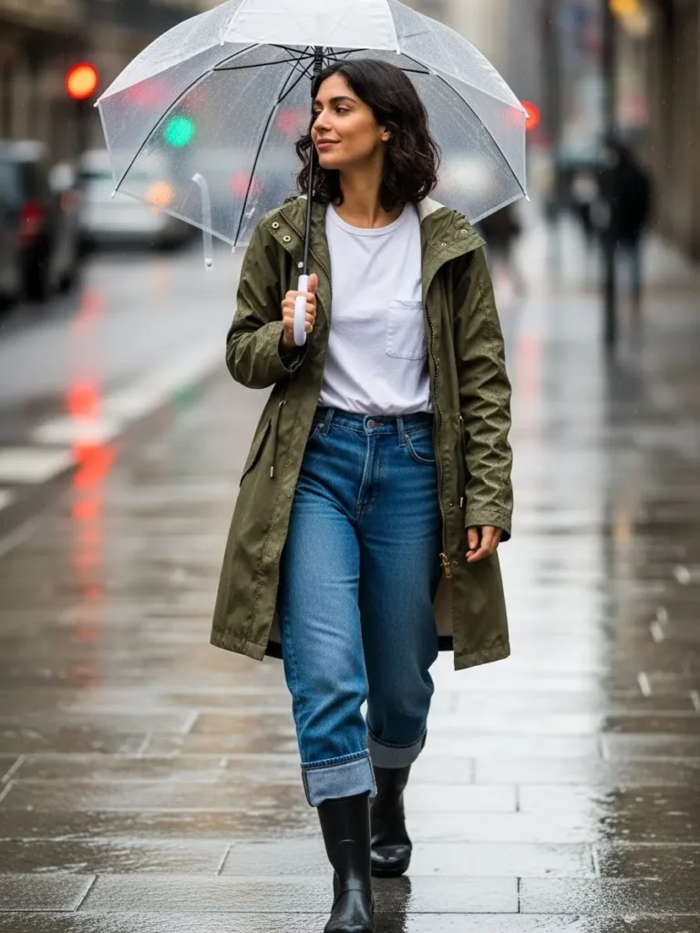 This outfit features a timeless olive rain coat layered over a simple white tee and classic blue jeans. Black ankle boots keep things practical for wet streets, while a clear umbrella adds a cute and functional touch that fits the rainy day mood perfectly.