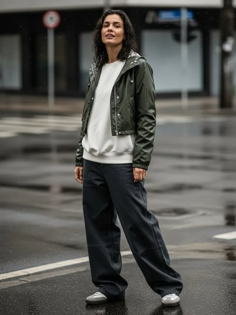 A cropped olive bomber jacket paired with a soft white sweatshirt creates a relaxed and modern vibe. Loose dark pants add comfort and movement, while casual sneakers keep the outfit grounded and easy for rainy walks.