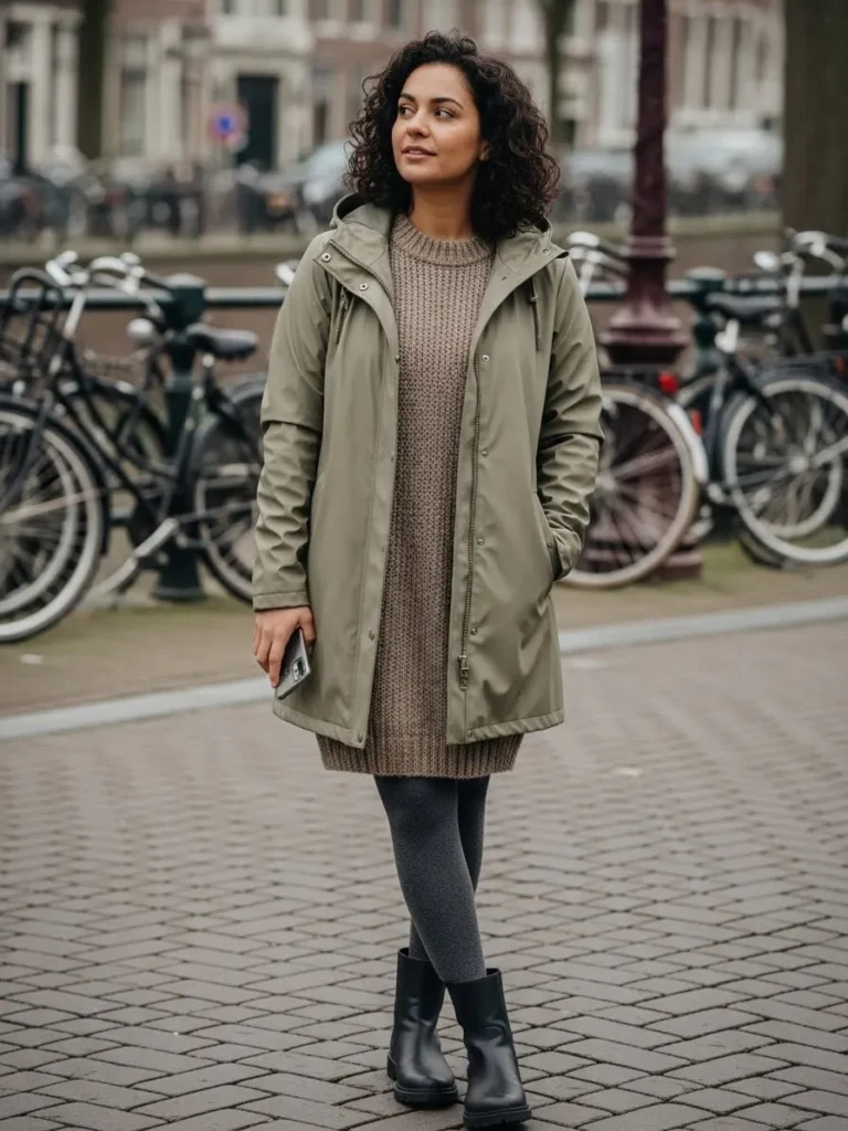 A light olive parka layered over a cozy beige knit creates a soft and calm rainy day outfit. Dark leggings and chunky black boots balance the look and add a bit of edge while staying weather friendly.