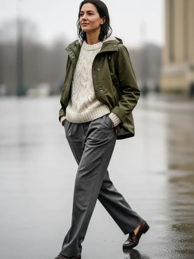 A chunky cream sweater paired with tailored gray trousers creates a polished yet relaxed rainy day look. An olive jacket adds protection from the elements while keeping the overall palette clean and neutral.