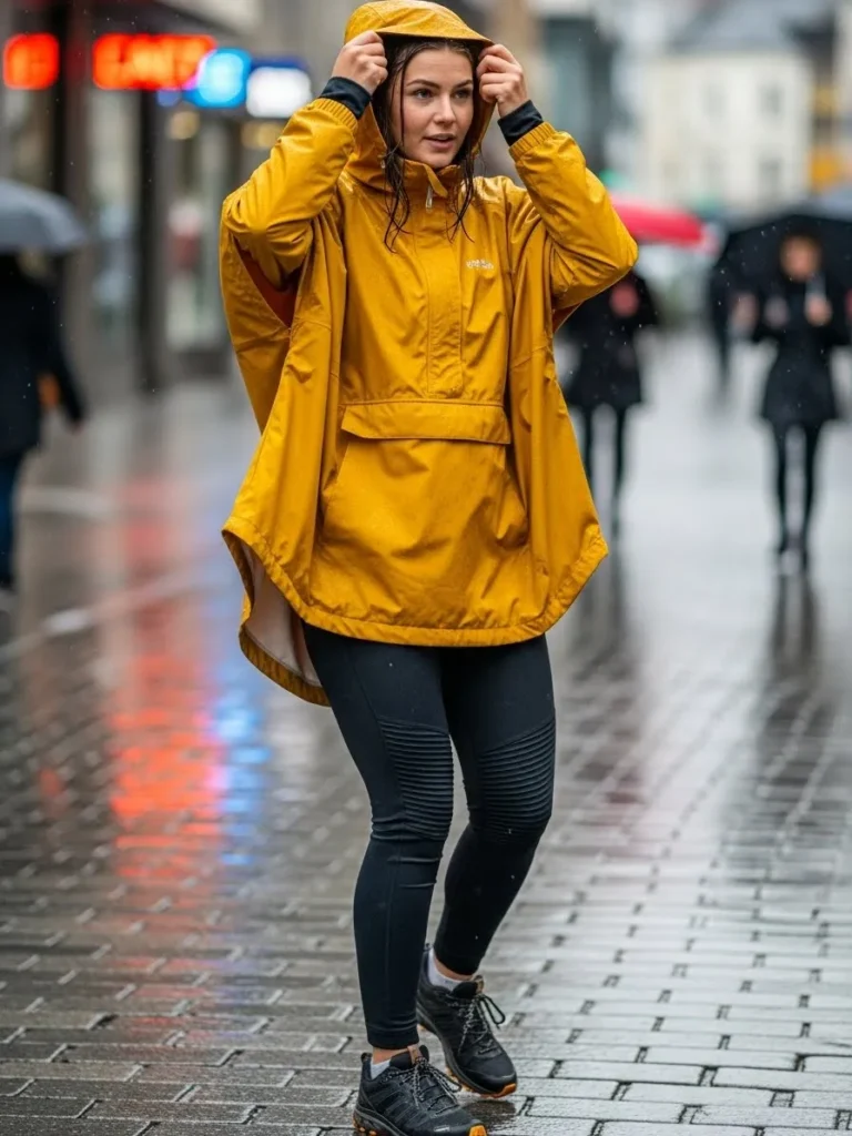 A bold yellow rain jacket instantly brightens a gloomy day and pairs perfectly with black leggings and sporty sneakers. The hood adds practicality while the color keeps the look fun and cheerful.