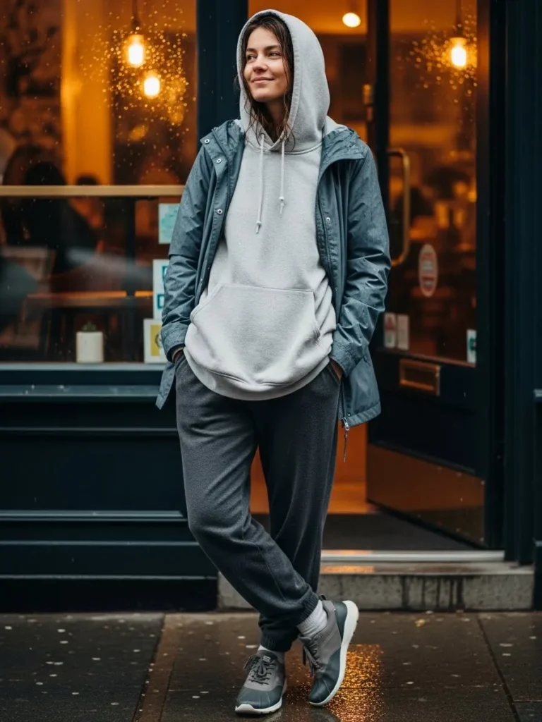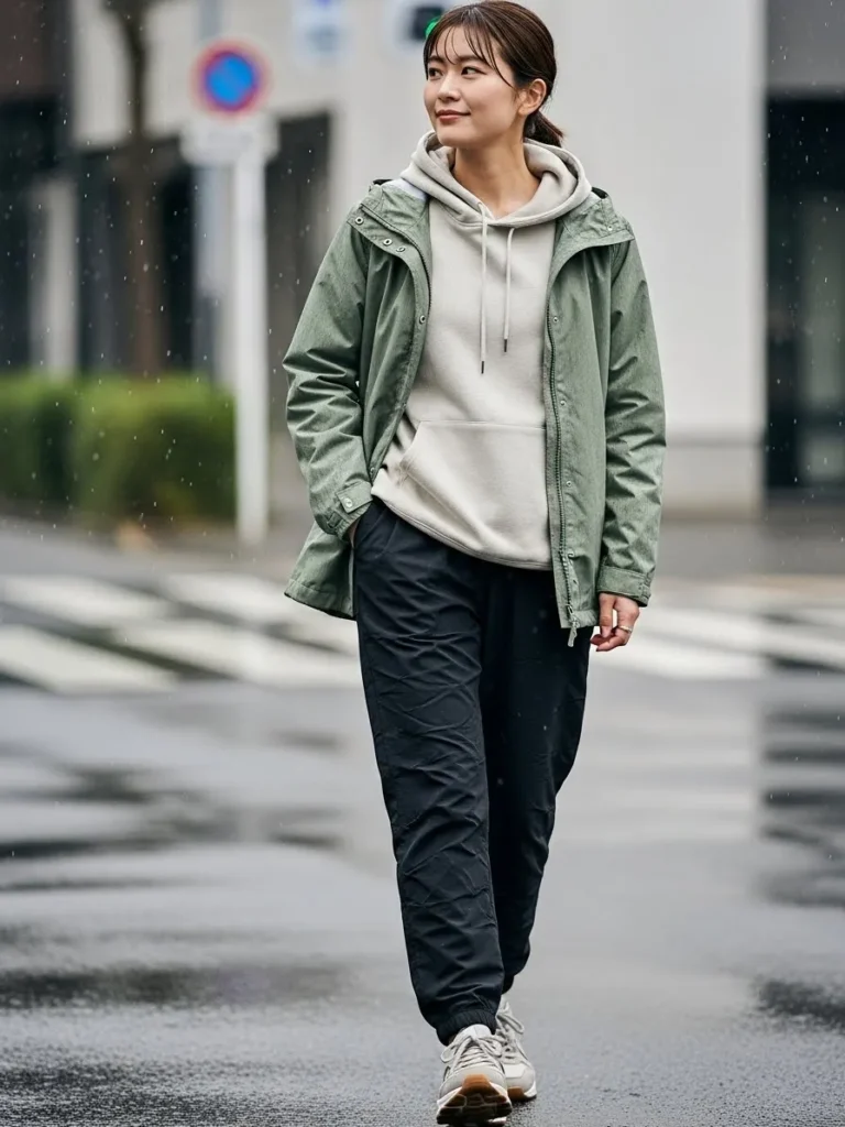 A sage green rain jacket worn over a light hoodie creates a sporty and relaxed vibe. Black jogger style pants and comfy sneakers make this outfit perfect for walking around on wet days.