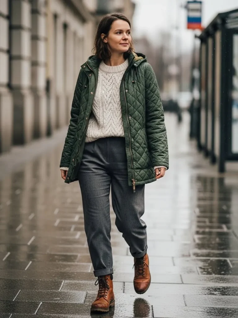 A textured green jacket layered over a cream knit sweater pairs beautifully with gray trousers. Brown lace up boots add warmth and a slightly rugged feel that works well for rainy city days.