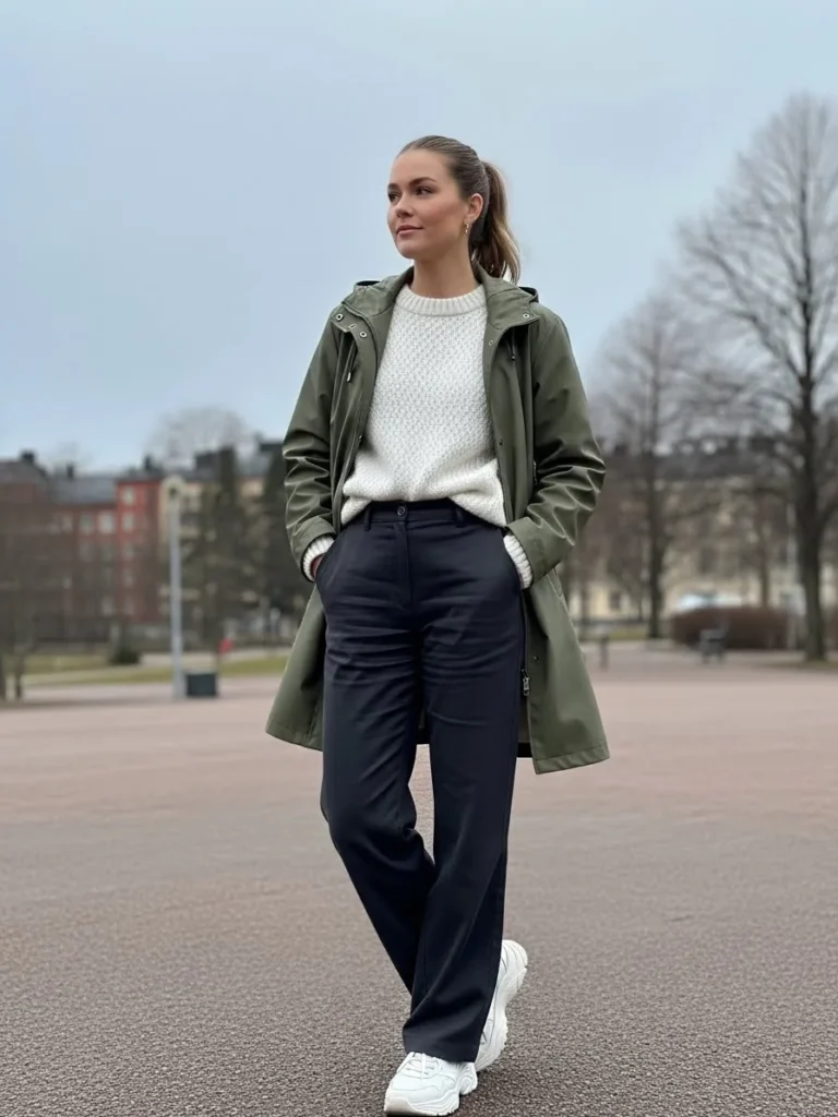 This look pairs a relaxed olive parka with a cozy cream sweater and tailored dark pants. Simple shoes keep it practical, while the clean lines give the outfit a slightly polished feel that still works perfectly for a rainy walk.