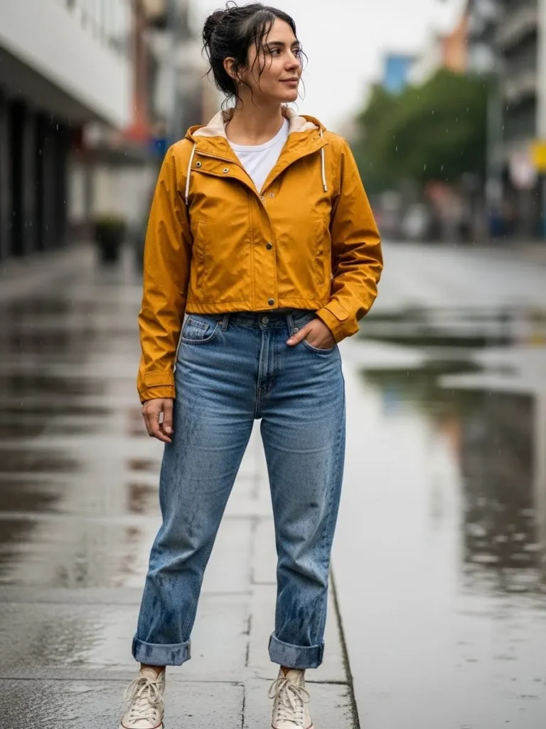A cropped mustard rain jacket adds a cheerful pop of color over a white top and classic straight leg blue jeans. Casual shoes keep the outfit easy and functional for slick sidewalks.