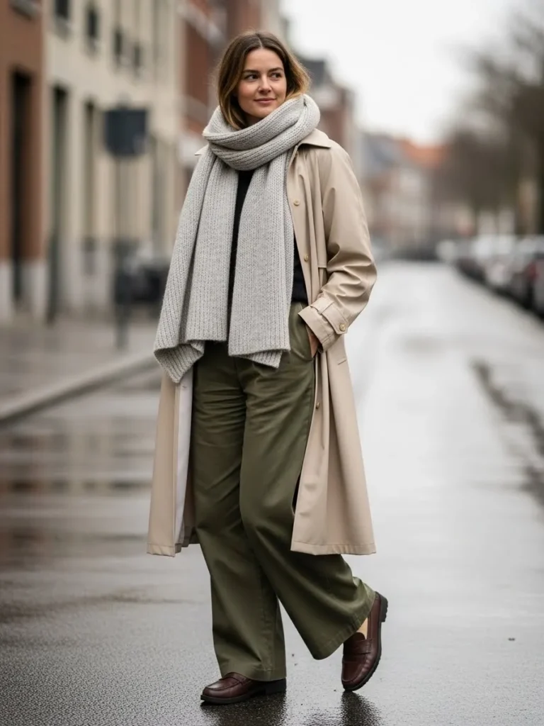 A light beige trench coat layered over soft neutral pieces creates an elegant rainy day look. Wide leg trousers and a chunky scarf add warmth and movement, while the muted palette feels calm and timeless.