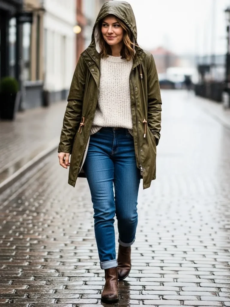 This outfit features a classic green jacket layered over a cream knit sweater and blue jeans. Brown ankle boots add warmth and texture, making it ideal for strolling through rainy streets.