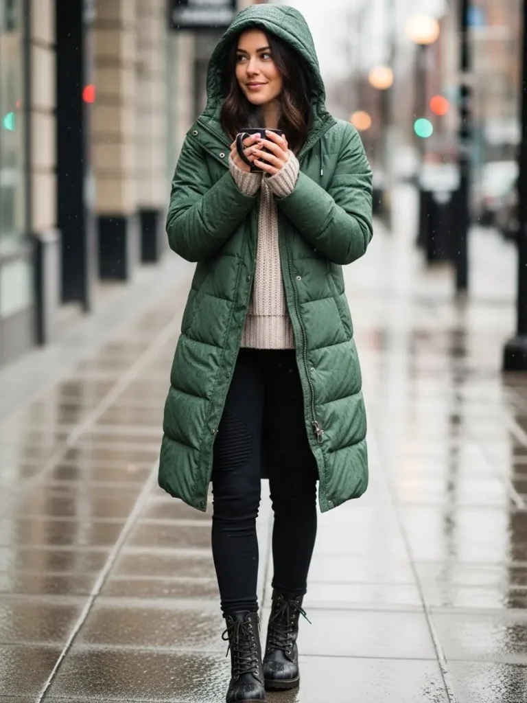 A long green puffer coat paired with black leggings creates a warm and weather ready outfit. Sturdy boots keep feet dry, while the hood adds extra protection from the rain.
