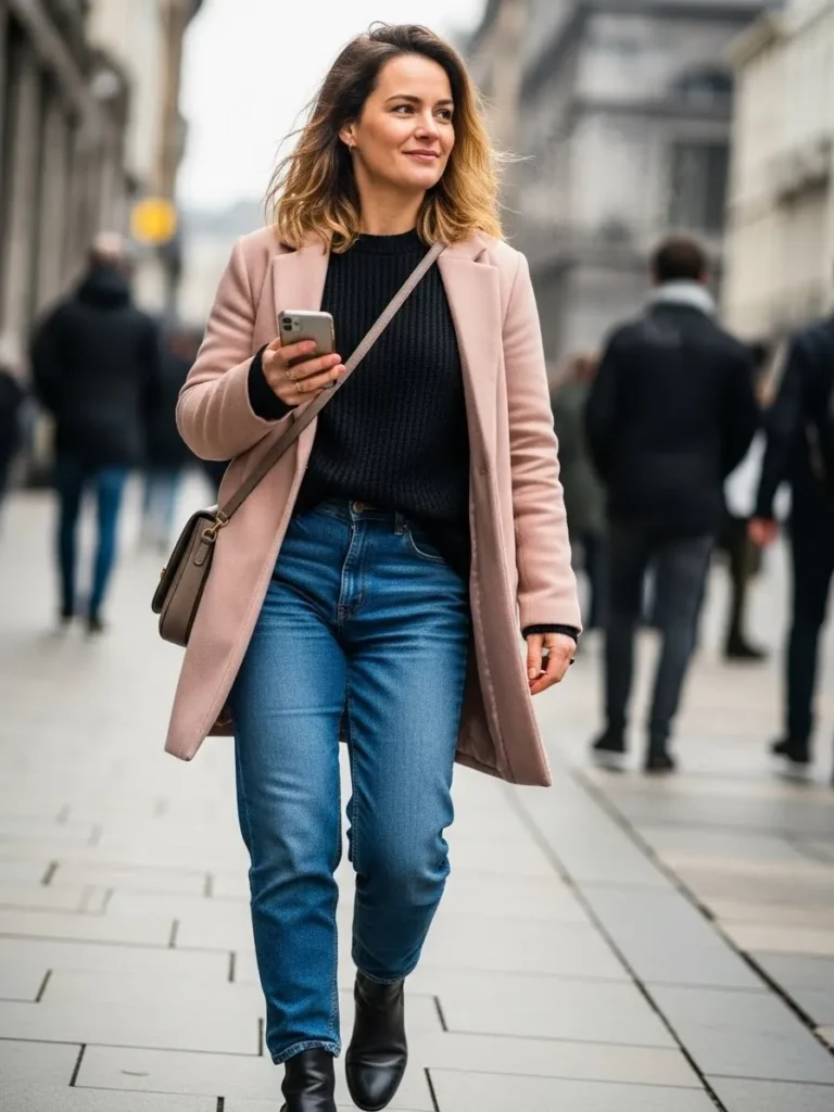 A soft blush coat layered over a black top and blue jeans creates a polished but relaxed outfit. The neutral tones keep it timeless, while the pink adds a subtle Valentine touch. It’s styled with a simple crossbody bag for an everyday feel.