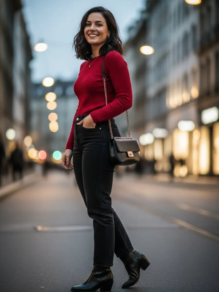 A red fitted sweater styled with black jeans and ankle boots creates a confident and chic Valentine look. The dark bottoms balance the bold top, making it feel sleek and modern. The outfit works well for evening plans.