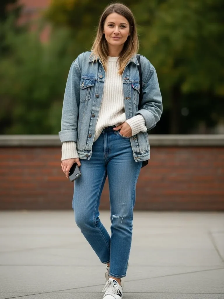 I love looks like this because they always feel effortless but still put together. The denim jacket adds structure, while the soft knit keeps it cozy. It’s flattering, practical, and perfect for walking around with friends without feeling overdressed.