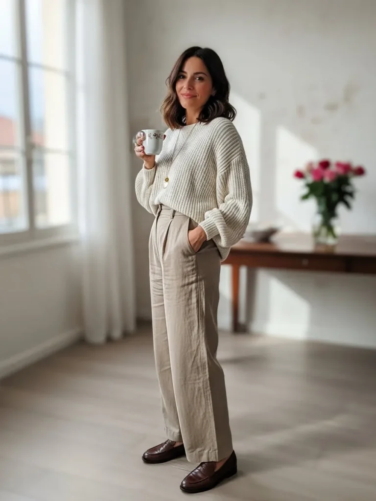 This look features a chunky cream knit sweater styled with light beige trousers and comfy flats. The soft textures and neutral tones create a calm and cozy feel that works beautifully for a relaxed indoor celebration. It looks warm, effortless, and quietly cute.