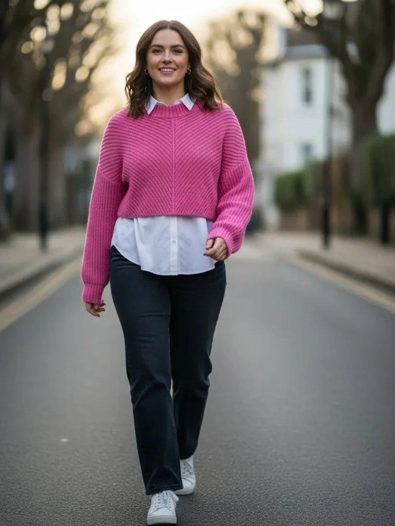 A bright pink sweater layered over a crisp white shirt brings a fun pop of color to this casual outfit. Paired with dark jeans and sneakers, the look feels youthful and perfect for a daytime Valentine hangout. The layered detail adds a bit of structure without feeling stiff.