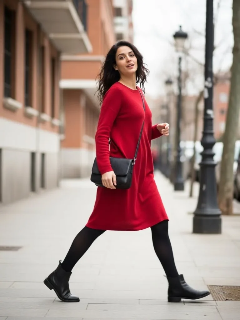 This outfit centers around a red knit dress styled with black tights and ankle boots. The silhouette is simple, while the bold color does all the work. It feels festive, cozy, and easy to wear all day.