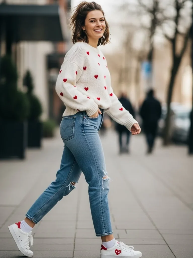 A white sweater with subtle heart details paired with light wash jeans creates a sweet and casual Valentines look. The sneakers keep it laid back, while the playful pattern adds personality. It feels cheerful and easygoing.
