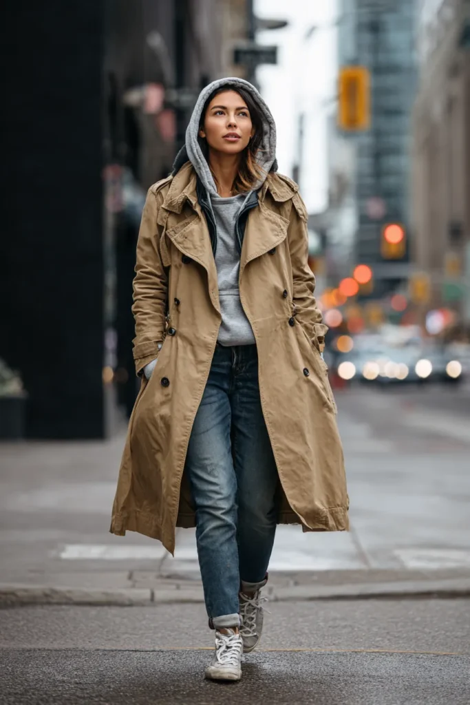 This outfit is the perfect mix of laid-back and stylish. She’s rocking a tan trench coat layered over a gray hoodie, paired with relaxed blue jeans and classic white sneakers. The combination feels effortlessly cool, giving that “I just threw this on” energy while still looking completely intentional. The neutral colors work so well together, and the trench adds a polished touch to an otherwise casual street look.
