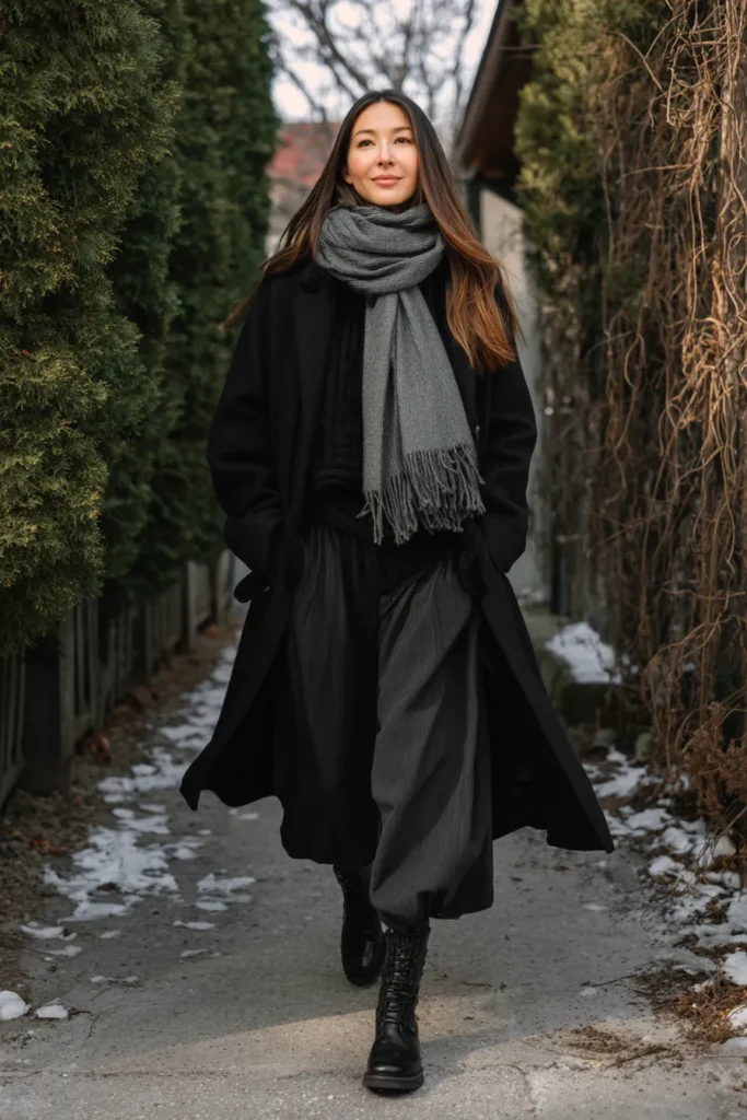 This outfit is a masterclass in cozy monochrome styling. She’s wearing a long black coat over a loose black sweater and flowy charcoal culottes, creating a look that feels both relaxed and refined. The chunky gray scarf adds warmth and contrast, while the lace-up combat boots give the outfit a subtle edge. It’s minimalist but full of personality—the kind of look that makes cold-weather dressing feel cool instead of complicated.