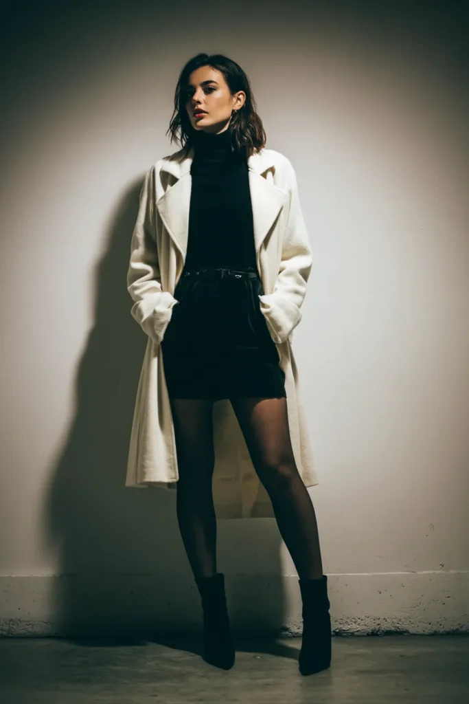 This outfit is sleek, bold, and effortlessly confident. She’s wearing a fitted black turtleneck tucked into a black mini skirt, layered with a long ivory coat that instantly elevates the look. The sheer black tights and ankle boots add just the right amount of edge, balancing sophistication with attitude. The clean contrast between the white coat and the all-black base makes the outfit pop in the most classic way.