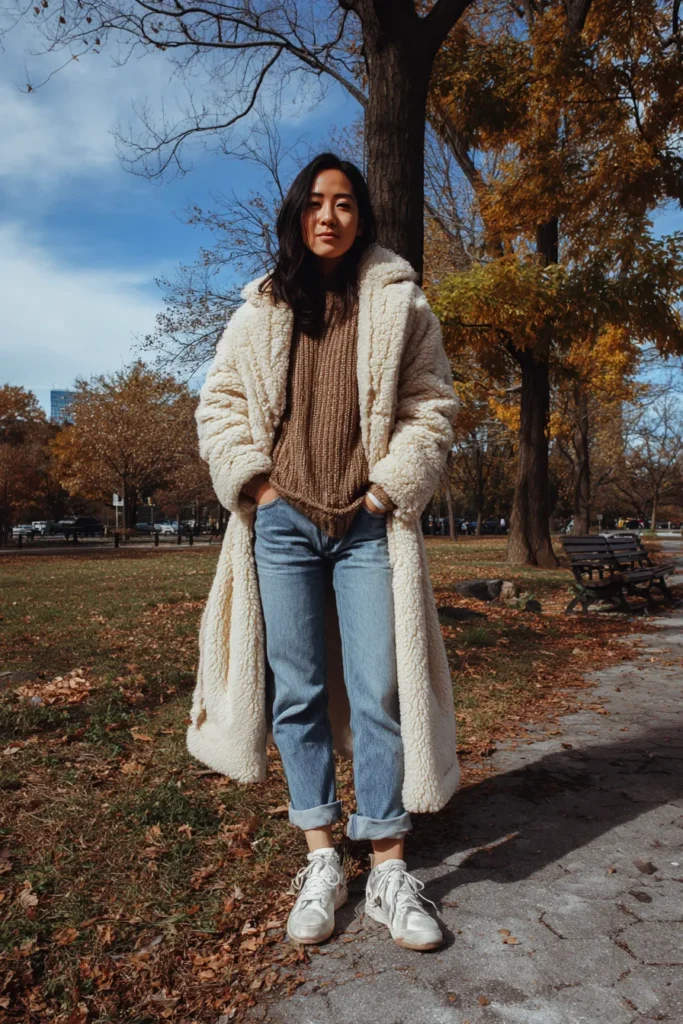 This outfit is the definition of casual comfort done right. She’s wearing a long sherpa teddy coat in a warm cream shade over a chunky brown knit sweater, paired with classic cuffed jeans. The white sneakers keep the look relaxed and effortless, making it perfect for weekend strolls or coffee runs. The combination of soft textures and earthy tones gives the whole outfit a cozy, autumn-into-winter vibe.