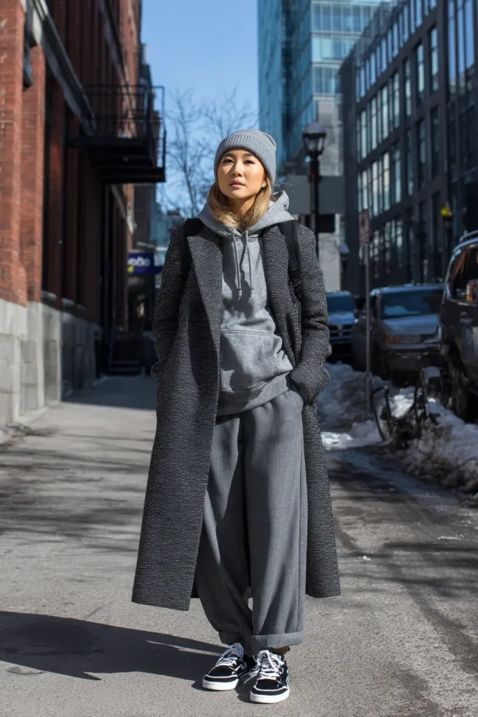 This outfit blends sporty comfort with street-style sophistication. She’s wearing a long textured charcoal coat layered over a classic gray hoodie, paired with wide-leg gray trousers that add a modern, relaxed vibe. The gray beanie ties everything together, and the black-and-white sneakers bring just the right amount of casual cool. It’s a perfectly balanced look that’s both laid-back and fashion-forward.