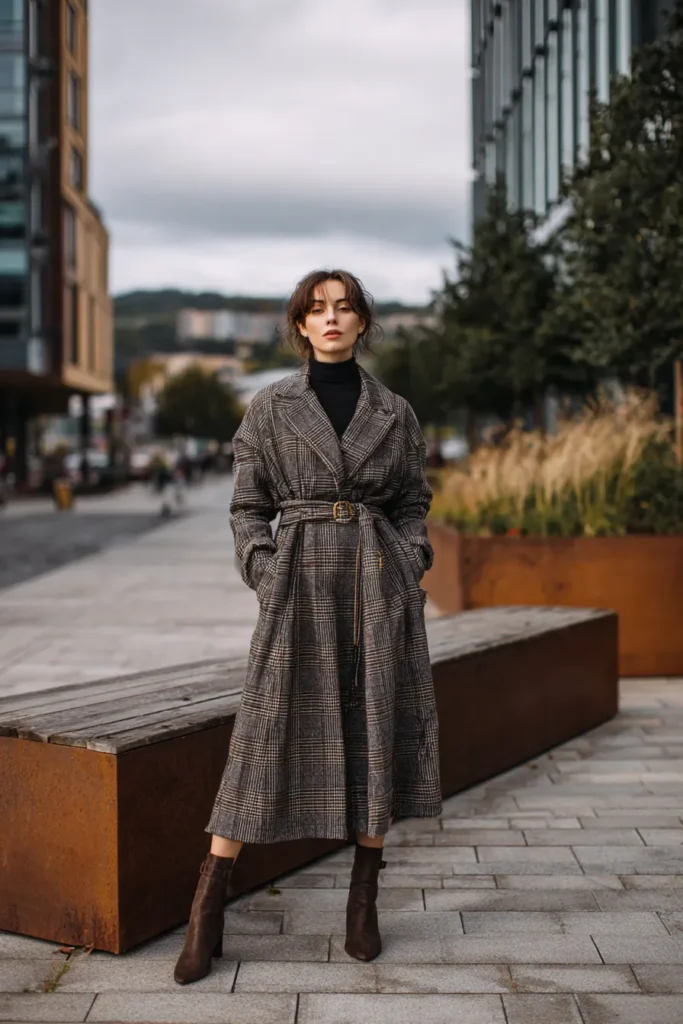 This outfit radiates sophistication with a touch of vintage charm. She’s wearing a long belted plaid coat in rich brown and gray tones over a sleek black turtleneck. The structured fit of the coat accentuates her waist, while the ankle boots complete the refined look with just the right amount of polish. The muted tones blend perfectly with the urban backdrop, making this a perfect city winter outfit.