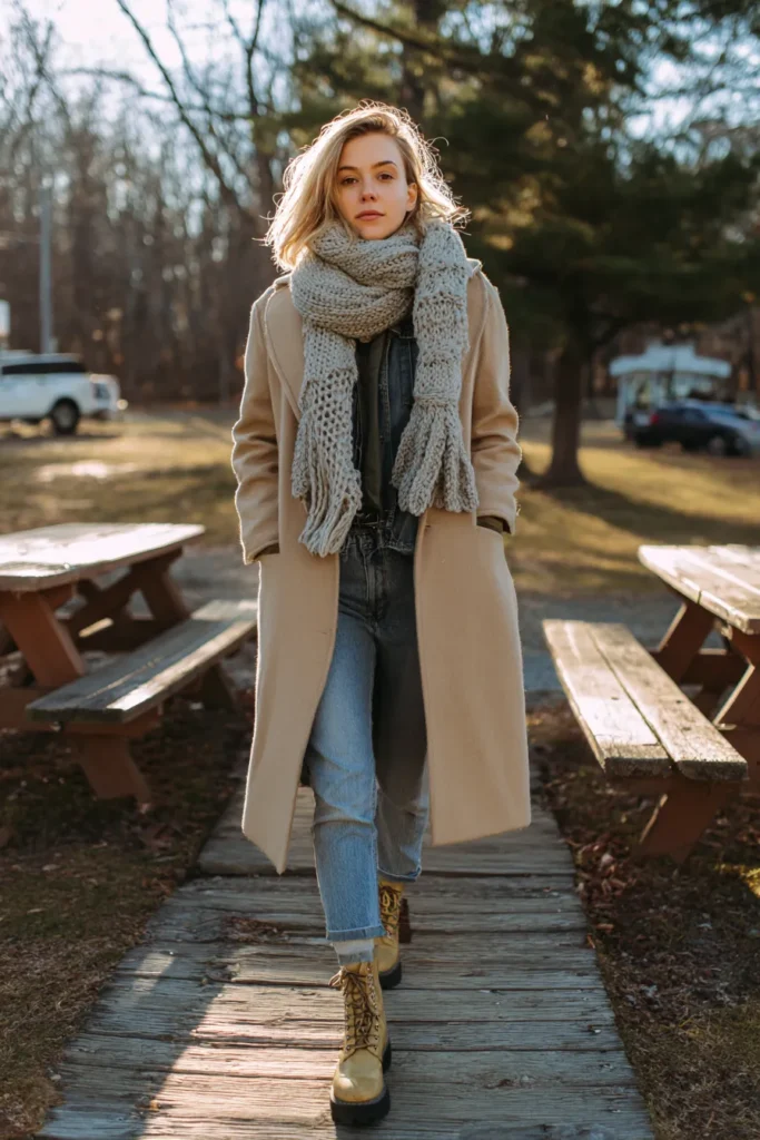 This outfit is all about practical layering with a cozy twist. She’s wearing a long beige wool coat over a denim jacket and light-wash jeans, topped off with an oversized chunky knit scarf that looks incredibly warm. The yellow combat boots add a bold, unexpected pop of color, giving this neutral-toned look a fun and adventurous touch.
