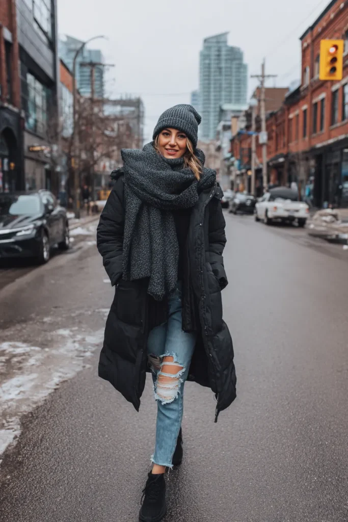 This outfit nails that effortlessly cool winter look. She’s bundled up in a long black puffer coat layered over a dark sweater, paired with ripped light-wash jeans that add a laid-back edge. The oversized charcoal scarf and matching knit beanie make the outfit extra cozy while keeping it stylishly coordinated. Black sneakers finish the look, keeping it practical yet trendy for city walks on chilly days.