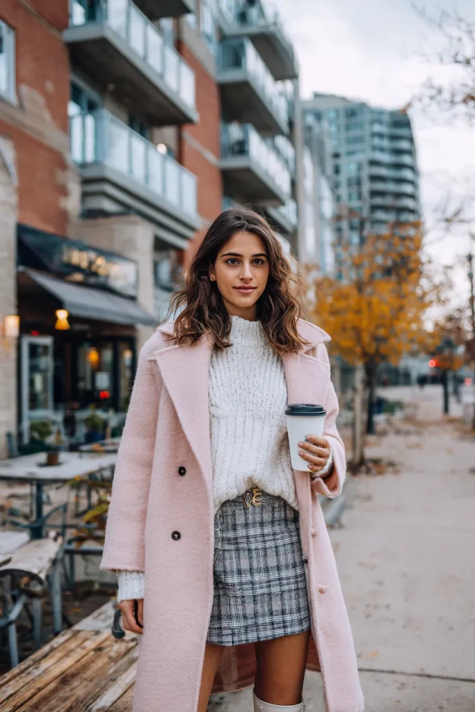What I love about this look is how feminine yet practical it is. The pink coat brings such a fresh, cheerful pop of color to gray winter days, while the plaid skirt keeps things timeless. It’s the kind of outfit I’d wear for a coffee date or a casual city stroll—simple but guaranteed to turn heads. Honestly, it’s hard not to feel extra confident when your outfit feels this cozy and put-together.