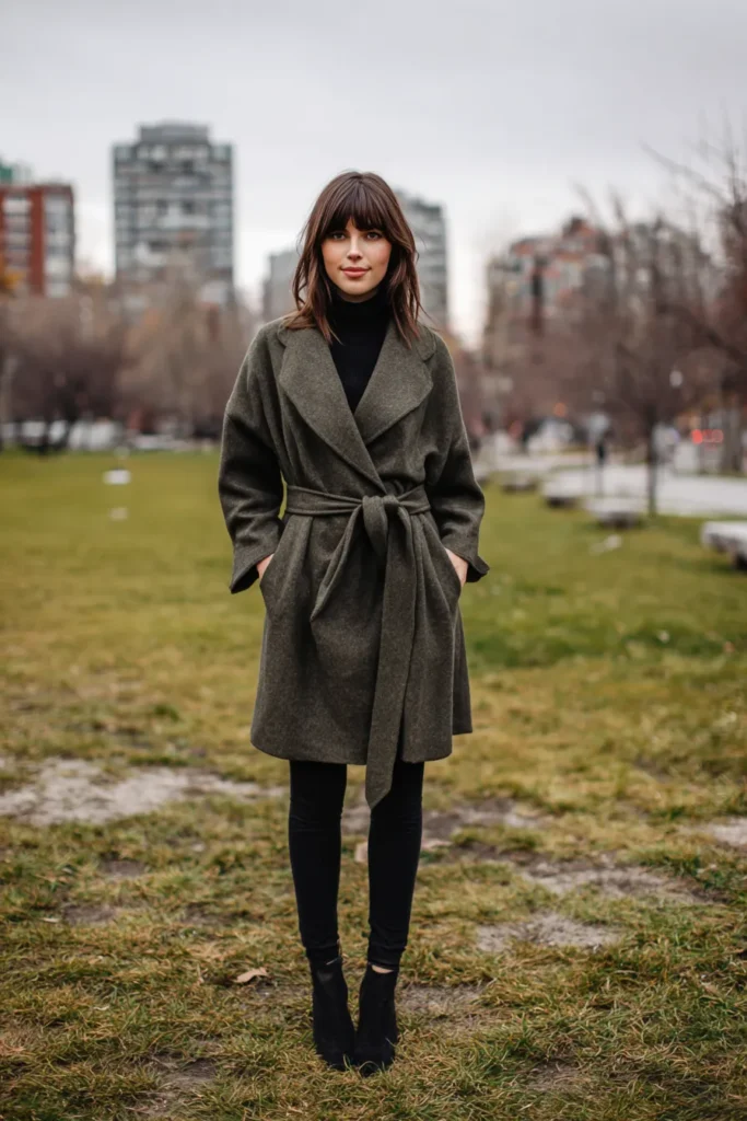 This outfit is the perfect example of understated sophistication. She’s wearing an olive green wrap coat that ties neatly at the waist, giving her a sleek and feminine silhouette. Underneath, a black turtleneck and fitted black leggings keep the look simple yet refined. The black ankle boots add just the right touch of polish, making the whole outfit look effortlessly pulled together.