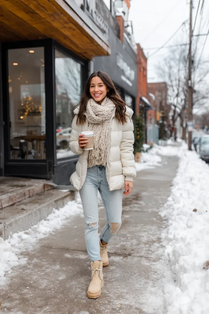 This outfit is all about keeping things warm and casual while still looking super cute. The creamy white puffer jacket instantly brightens up a cold winter day, and the oversized chunky knit scarf adds that extra layer of snug comfort. Paired with light ripped jeans and beige lace-up winter boots, the look feels easygoing but stylish at the same time. It’s the kind of outfit that balances cozy textures with casual streetwear vibes.